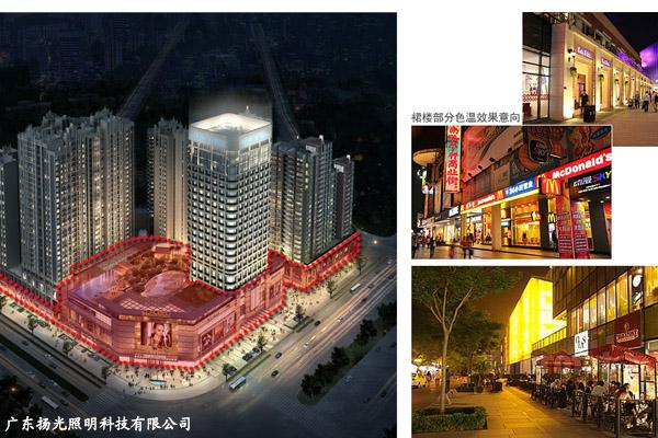 第一亮度區(qū):裙樓部分。裙樓部分多為臨界街店鋪或商廈入口,是聚集人氣的地方,因此需要考慮較高的亮度。此區(qū)域色溫宜選擇柔各的暖色為主色調,各式廣告牌和LED顯示屏為輔,烘托商業(yè)區(qū)的熱鬧,繁華。