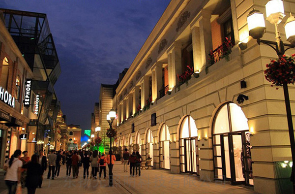 沿街建筑展示立面,營造清晰明亮、華麗尊貴、溫馨浪漫的夜景燈光氛圍。照明偏向?qū)ν馍虡I(yè)氣氛的表達(dá);燈光對(duì)外具有吸引性。